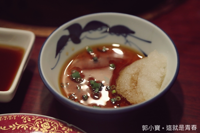 工作人員會主動送上烤肉調味醬汁,除了烤肉醬以外,還有蔥花跟醋,另外一碗是醬油跟白蘿蔔泥。 |