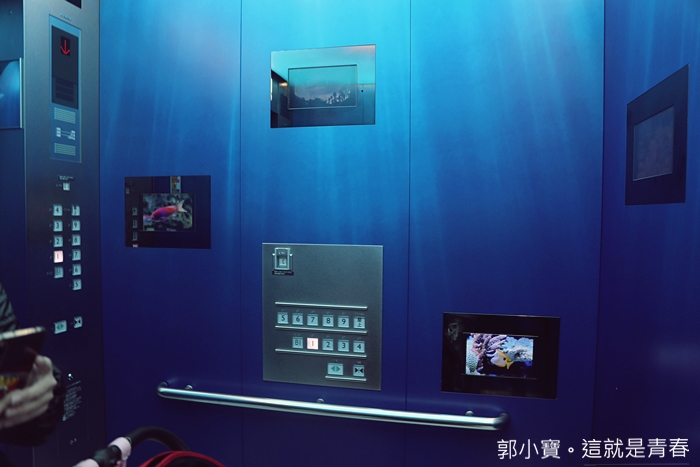 下樓的時候才發現電梯有一部是水族館主題的快速電梯。 |