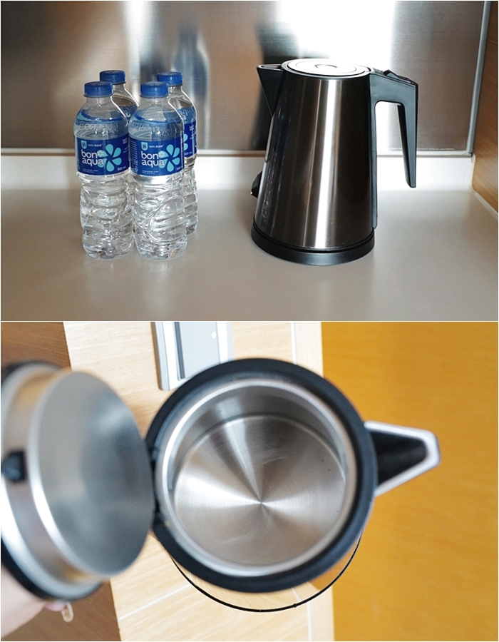 熱水壺洗得很乾淨,我住飯店都會先看一下熱水壺有沒有洗乾淨這種小細節,礦泉水不夠可以打電話給櫃檯請他們送。 |