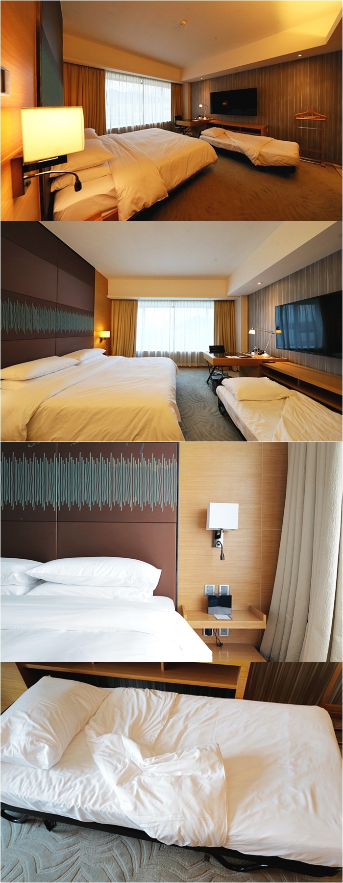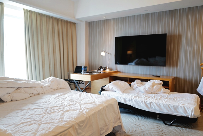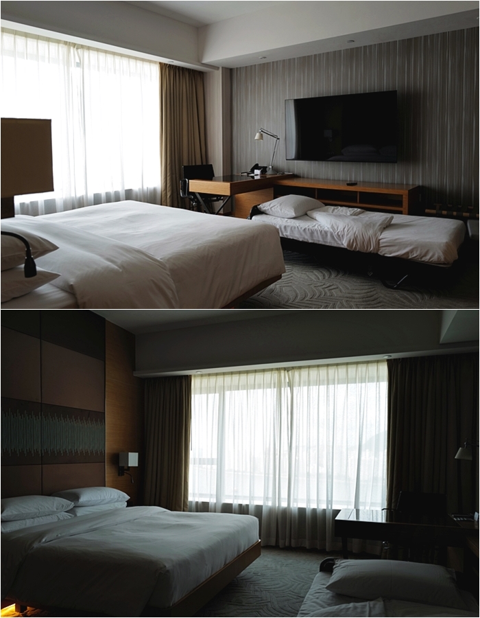 推開隔間木門來到房間,我們有加一張單人床,這單人床不是我就是我女兒睡,房間空間也滿大的,我很喜歡 沙田凱悅酒店的採光,窗簾有兩層,全遮蔽的話遮光性極佳。 |