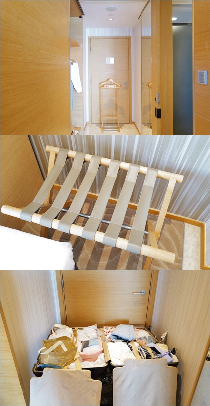 房間另一邊則是衣物間跟衛浴空間,我們將行李架放到最後面,這樣打開行李剛剛好完全不戰任何空間。 |