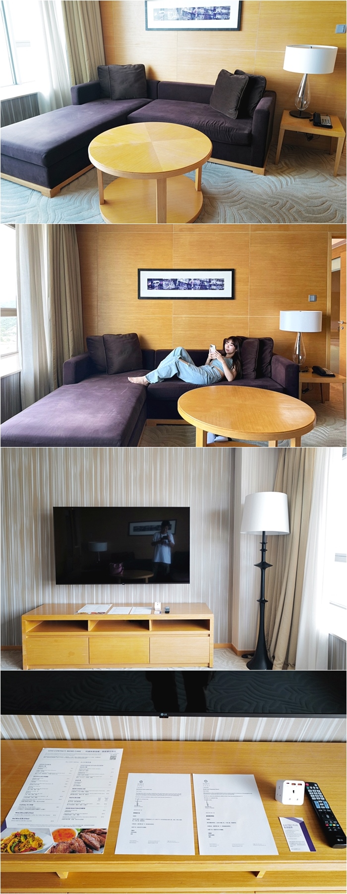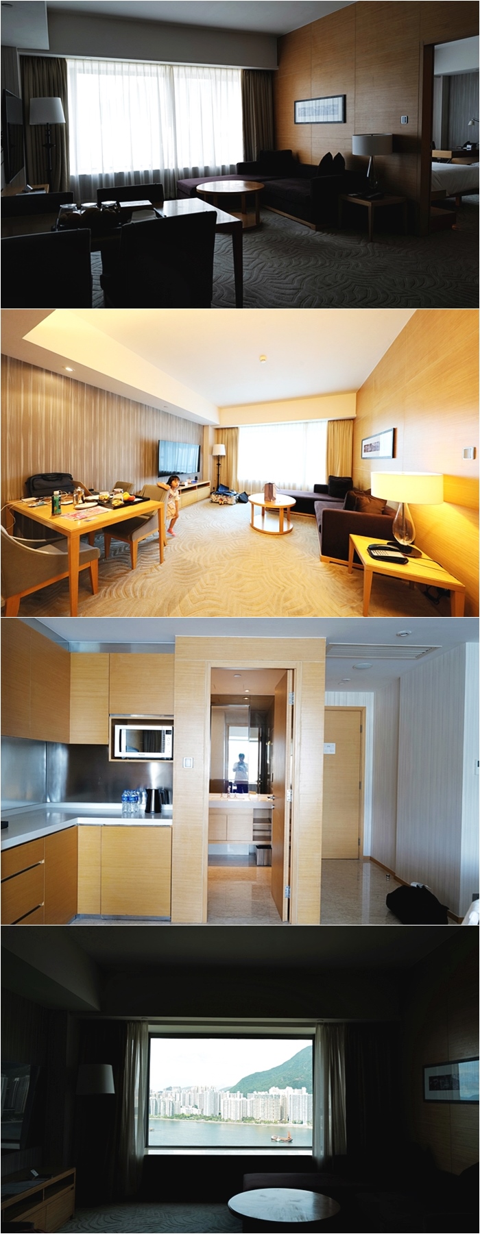 一打開房間門讓我滿驚訝的,雖然我們一開始就知道是套房,但是這客廳的空間也太大了,其中一個角落還有小廚房,獨立的客廳廁所加上長桌用餐桌椅,且大面積落地窗的採光相當棒,窗外的景觀就是港灣的風景,一整個讓人心曠神怡,這樣的房間隊我們來說很適合,因為很久沒來香港了,很多香港朋友紛紛要來酒店找我們,這客廳就可以大聊小酌了。 |
