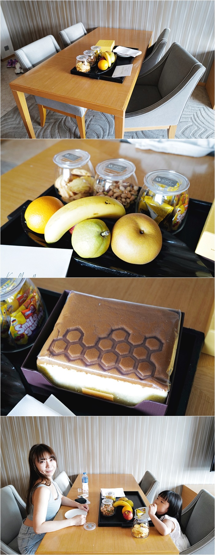 長桌上有準備水果跟零食給客人,且零食給的超大方,三冠分別是滿滿的手工餅乾、堅果、MM巧克力,光是超大罐的堅果就很貴的,水果的種類也滿多的,另外還有凱悅酒店非常有名的蜂蜜蛋糕。 |