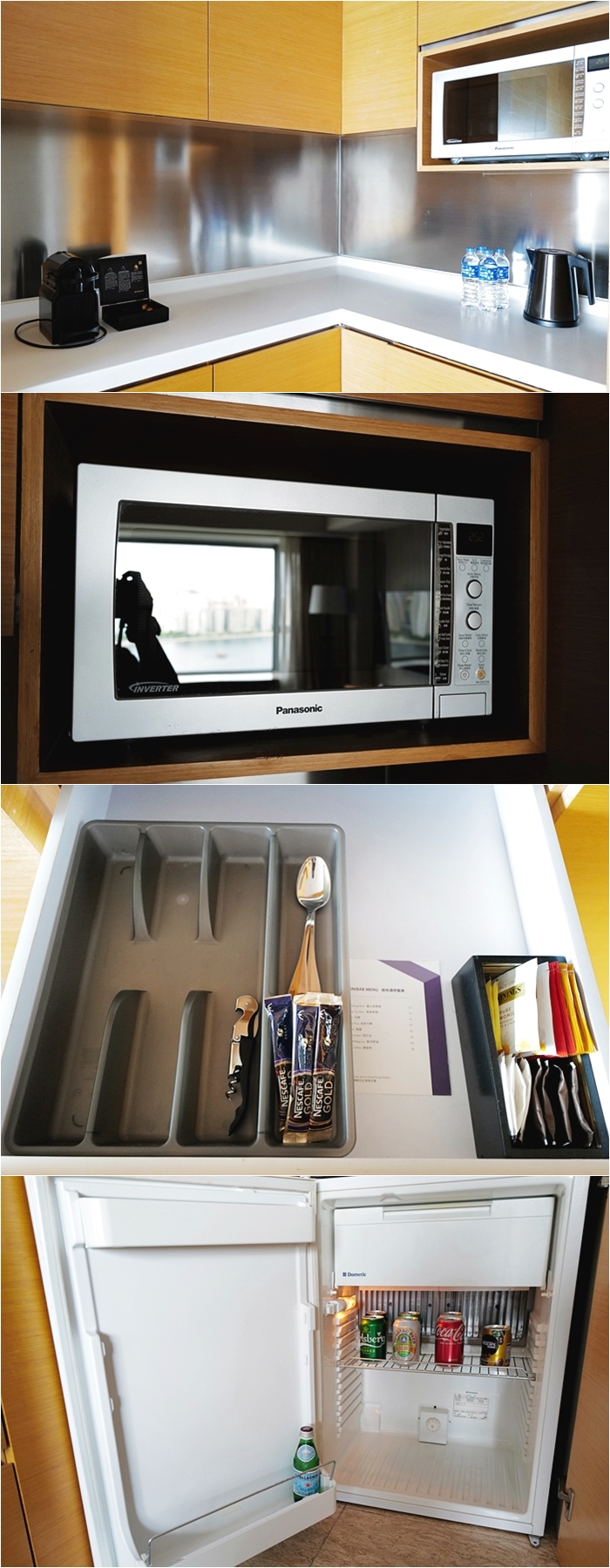 小廚房最重要的是有一台微波爐,對於有小孩子的家庭來說,微波爐非常重要,因為小孩子度子餓的時間點都滿莫名其妙的,有台微波爐隨時可以加熱餐點給小孩吃,搭配一台全自動膠囊咖啡,冰箱則是在下方櫃內,裡面有飲料,記得冰箱飲料可以先詢問櫃檯是否另外付費。 |