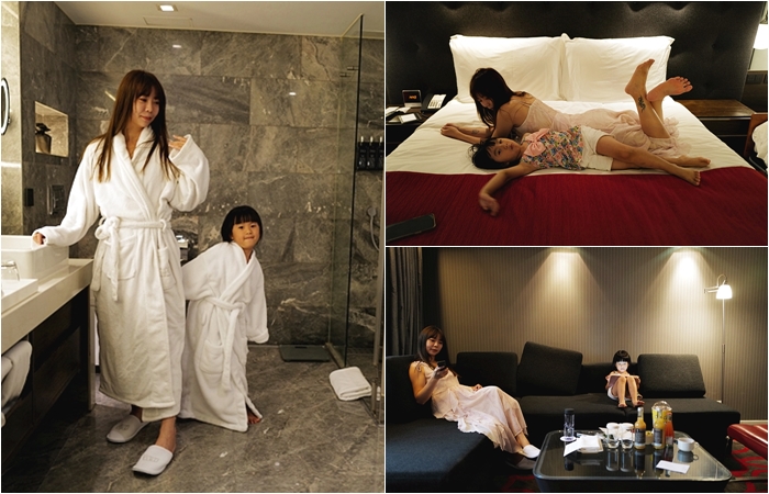 桌上還有迎賓午茶跟點心,母女倆就毫不客氣的坐起來嗑了,當他們在享受著電視跟平板的同時,爸爸我正在搬行李就定位,沙發坐起來是使用高密度泡棉,彈性很好。