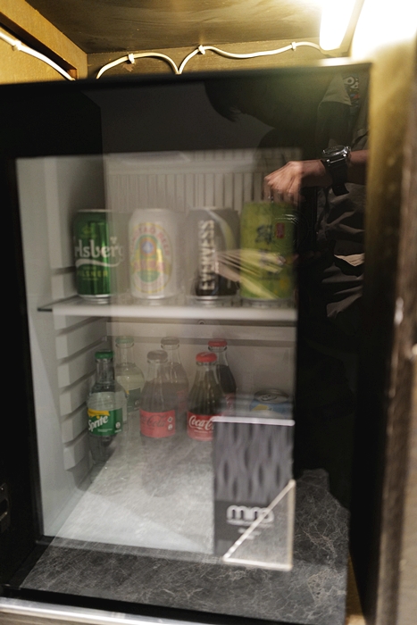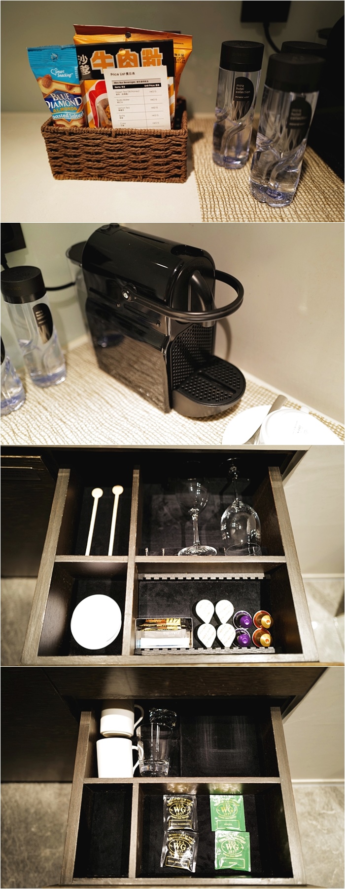 客廳旁還有一個小調理台,調理台上的零食餅乾是需要付費的,酒店也貼心地放上價目表讓客人知道費用再自己決定要不要取用,另外還有一台膠囊咖啡機,膠囊咖啡跟杯盤組都在抽屜哩,咖啡是不用付費的,對於早上起來都想喝一杯咖啡的太妃來說,膠囊咖啡真的很實用,另外也有提供茶包。