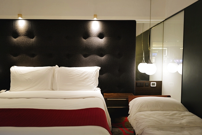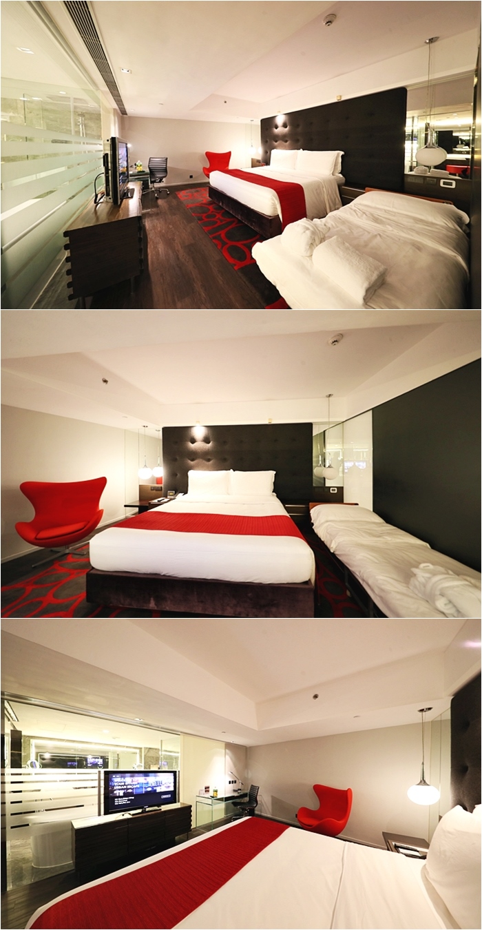 推開客廳的房門就可以進入到房間,房間也很有氣氛,同樣的紅黑地毯貴氣奢華感十足,搭配紅色單人沙發椅超有時尚感,房間的空間也滿大的,重底是空調超給力,香港的夏天真的非常悶熱,每次回到房間都覺得又活了過來,有提供加床服務。