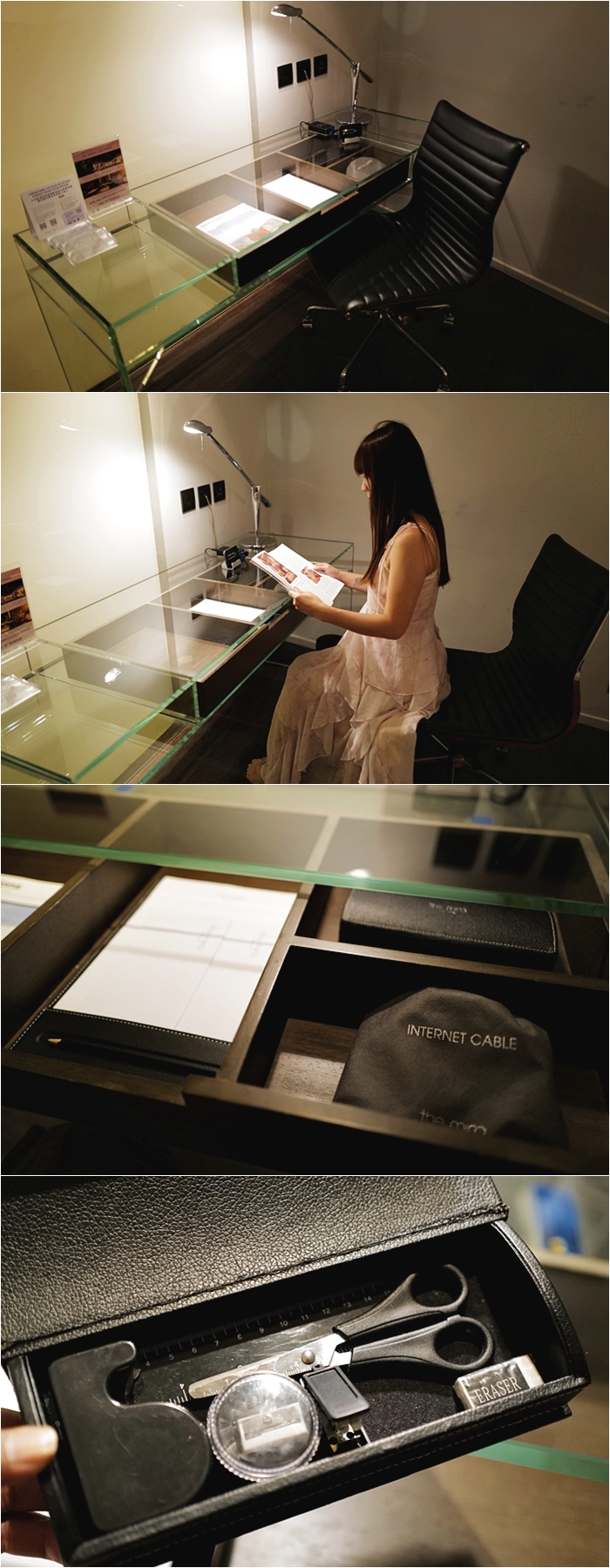 辦公桌面是透明玻璃顯得很有格調感,彈性皮面辦公椅有滿好坐的,辦公用具應有盡有。
