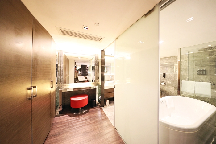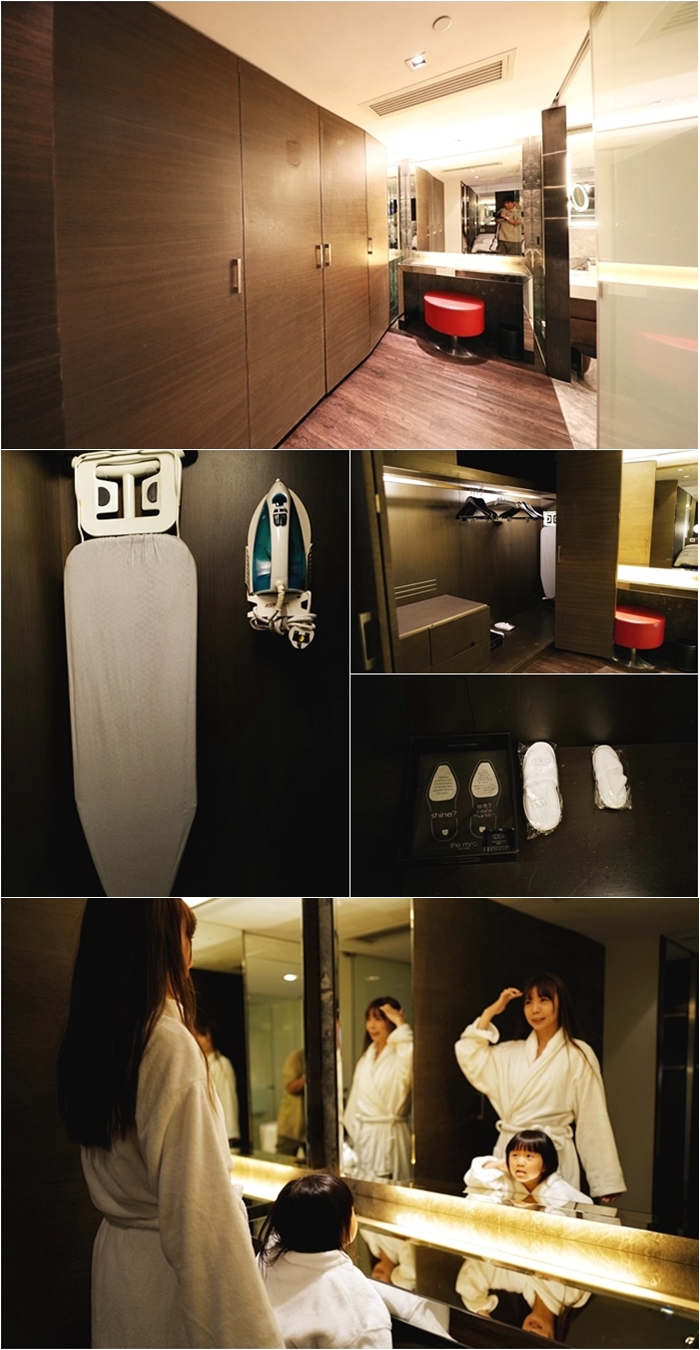 一整面的衣物櫃跟行李架,對於女生來說超級貼心又方便,且都有提供熨斗跟燙衣板,我發現好像香港的飯店都會提供熨斗跟燙衣板,對於亞洲其他地方的酒店好像很少見到,還有女生最需要的化妝台,超大鏡子獲得母女倆的讚賞。