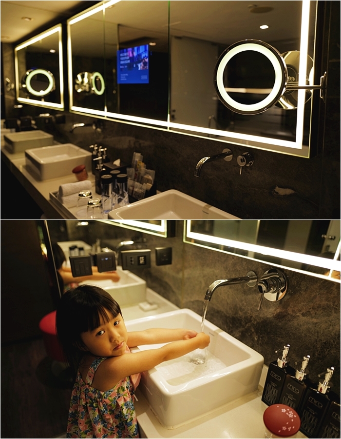 鏡子上還有一個小電視銀幕,旁邊還有小椅子剛好可以讓小朋友站上去開水龍頭,洗手台的檯面也超大,老婆放置她的保養用品跟隱形眼鏡盒、藥水都很好放置。