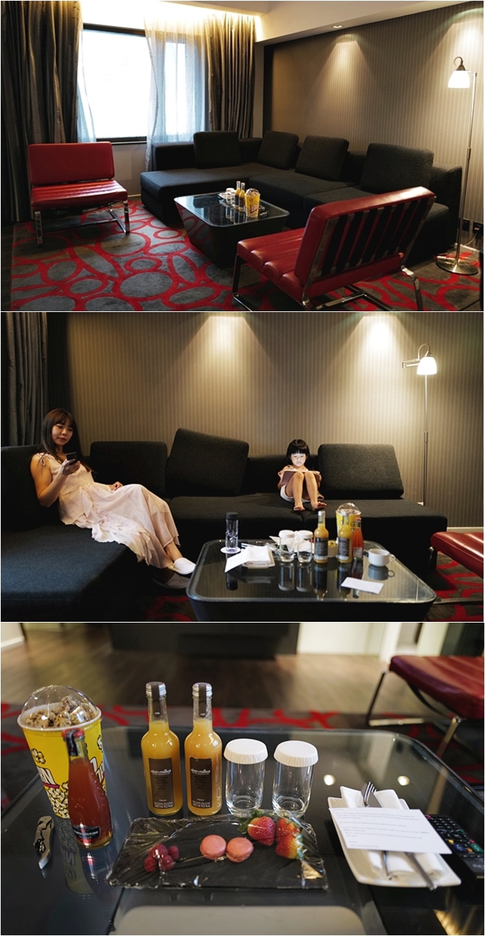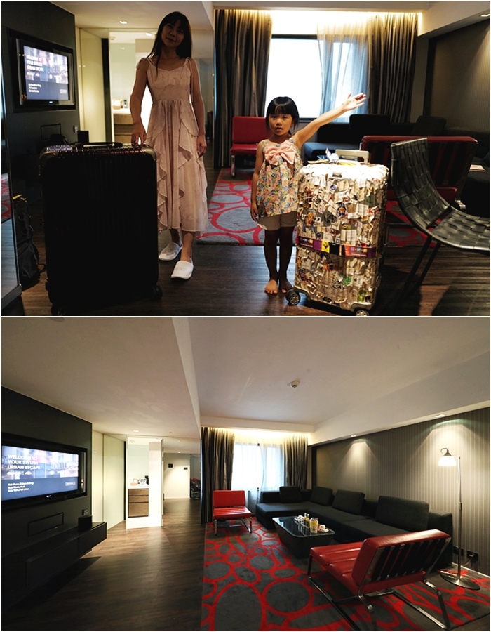 我們這次入住美麗華是屬於一房一廳的家庭套房,推開門看到的客廳我們也很喜歡,客廳非常大,地毯紅黑配色相當有貴族風,長型沙發還有紅色單人座沙發看起來都相當大氣。