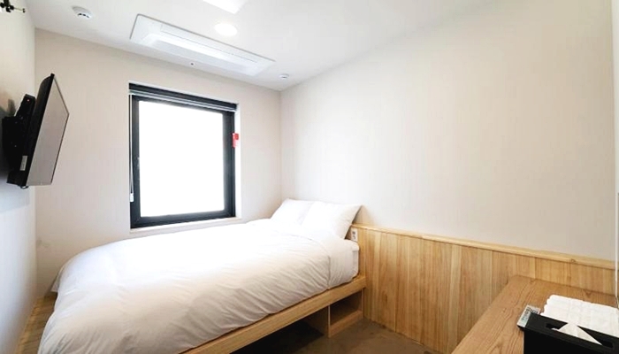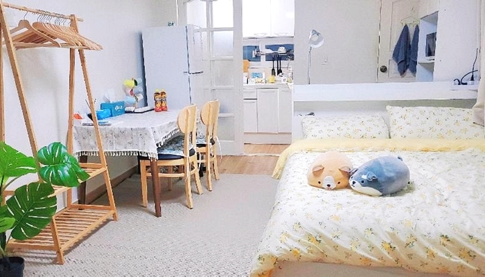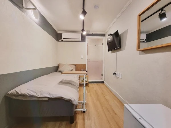 地點在新村鬧區,地點好方便,近地鐵2號線及機場線,樓下就是橋村炸雞,適合背包旅客一人一間。