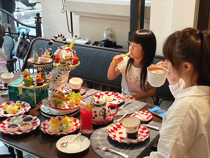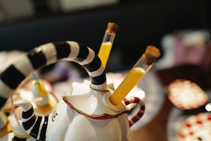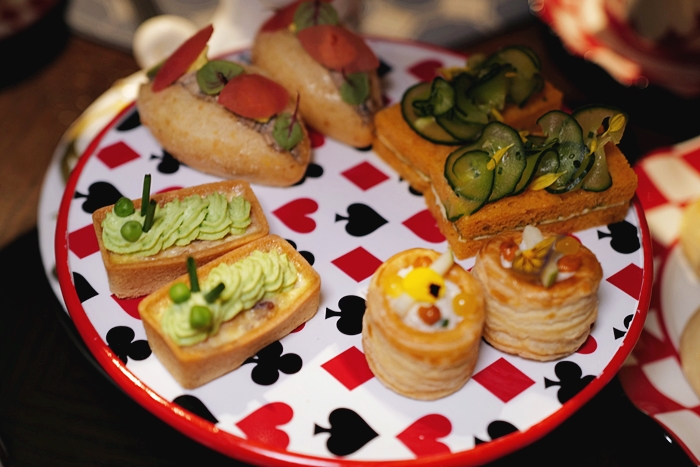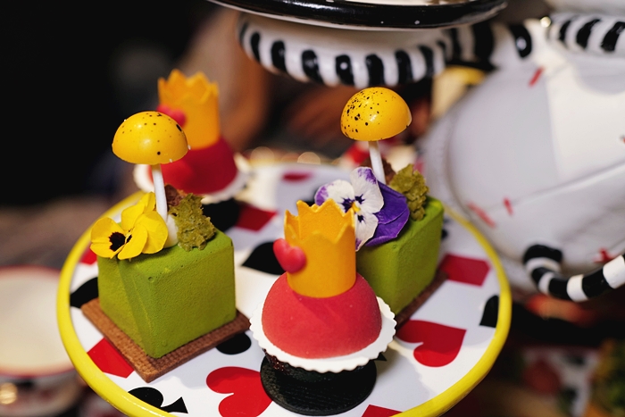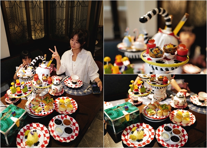 擺滿整張桌子的愛麗絲奇幻仙境下午茶,看起來超壯觀。