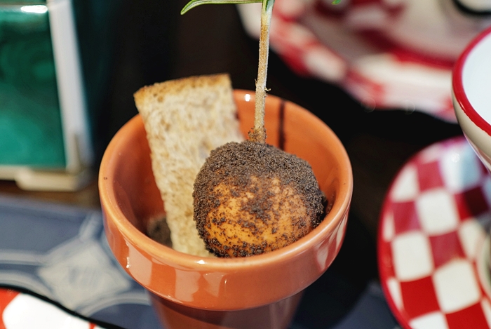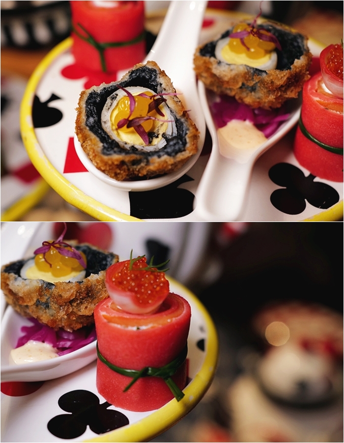 愛麗絲黑色蘇格蘭鵪鶉蛋配大蝦、百香果魚子醬及捲心菜