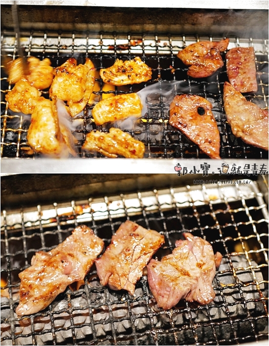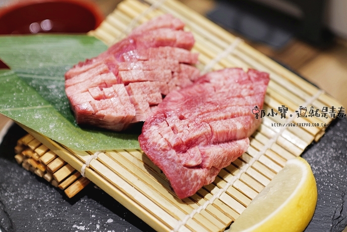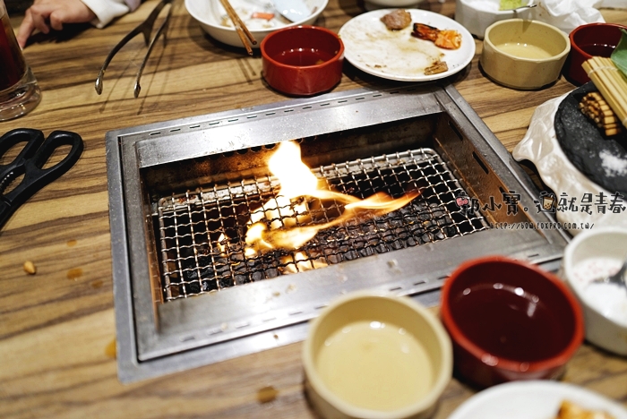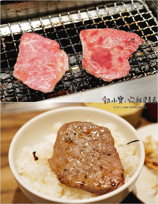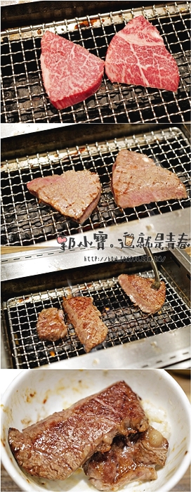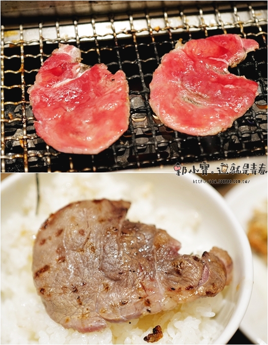 這一道也是俺的燒肉的特色菜單,這一道肉是牛臉頰肉,後來才知道其實上桌就可以吃了,電家標榜著已經先低溫烹調到中心,所以可以不用在燒烤,可以直接享用,一邊是加醬汁一邊是蔥鹽,後來看照片才發現,確實牛臉頰肉邊緣都有點熟掉的感覺,不過當下我們還是放下去考了一下,牛臉頰肉吃起來Q脆,肉汁頗多。 |