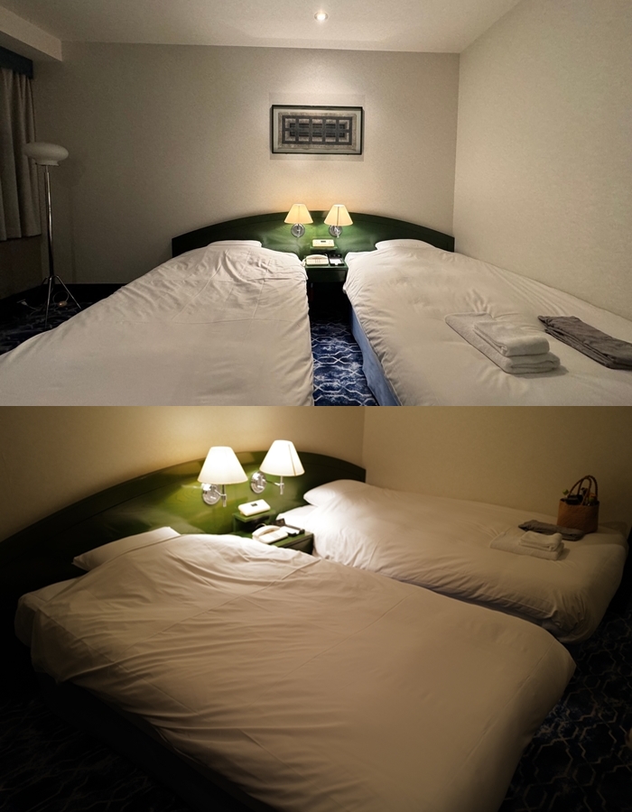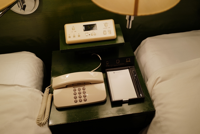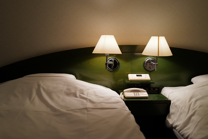 兩張單人床都是大號單人床墊,床板也是綠色絨毛,整體感覺起來非常高雅,床頭燈是一邊一個,互相不打會打擾到隔壁床。 |