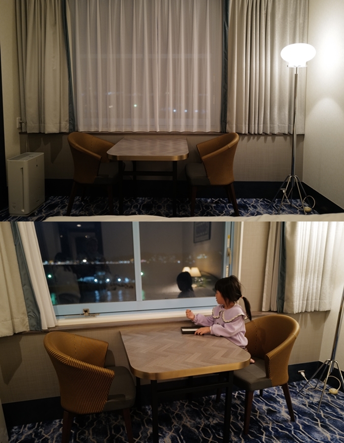 一旁還有方桌跟沙發椅,即使這樣還是有很多空間可以放置行李箱,這空間讓我們非常滿意,女兒在桌上可以畫圖吃餅乾。 |