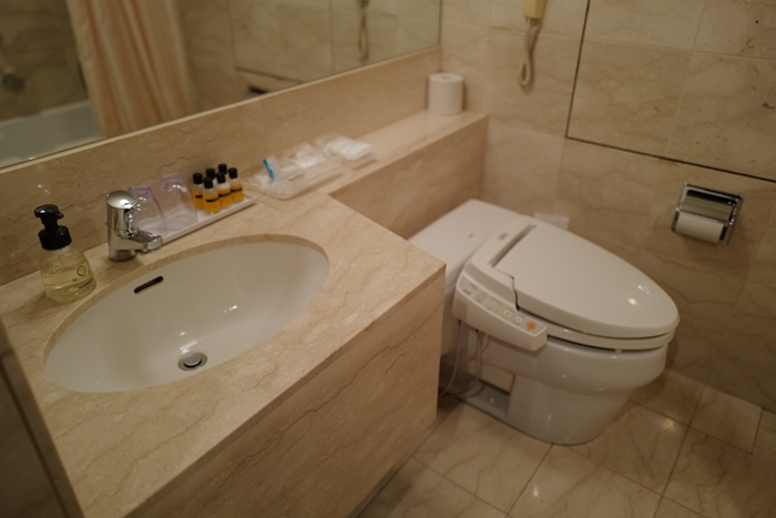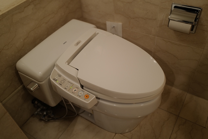 浴廁非一體式浴廁,現在日本大部分的商旅跟旅館很多都是使用一體成形的廁所, 門司港普樂美雅飯店則是早期水泥搭配磁磚打造的廁所。 |