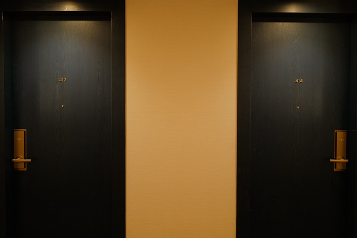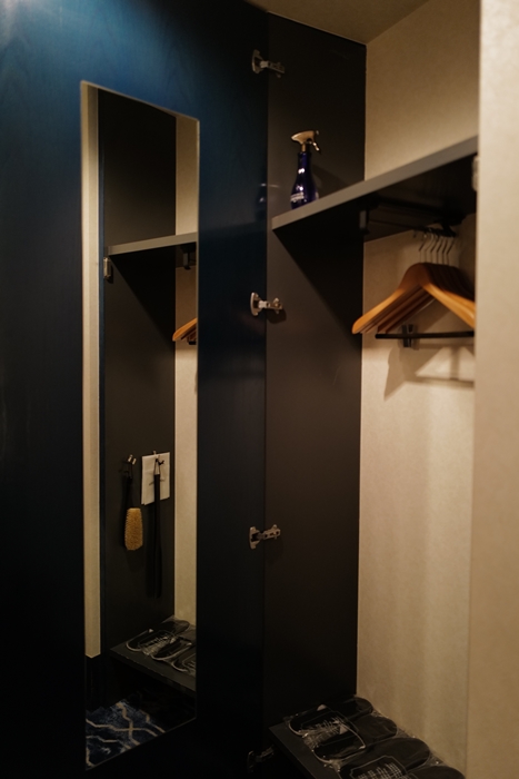 打開房門後進入到玄關通道,門後方就是吊掛式衣架,全身鏡則是鑲崁在門後。,玄關通道頗為寬敞。 |