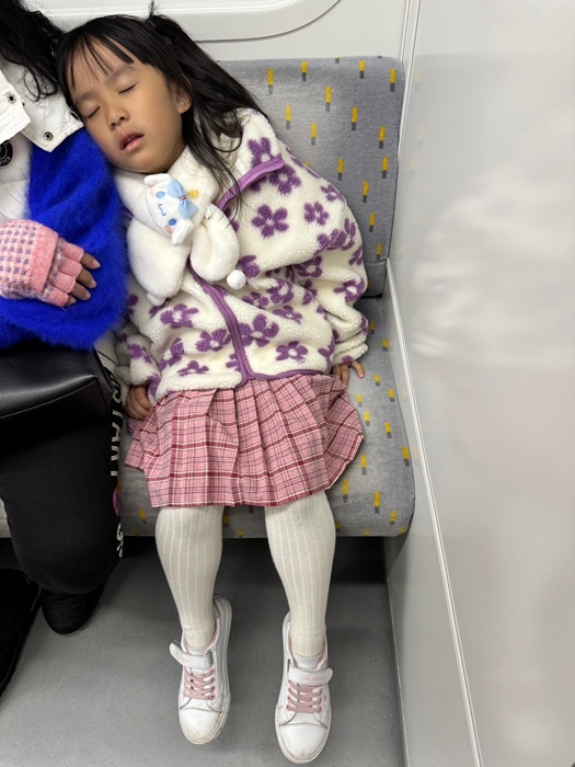 玩了一整天回程的電車上斷電的女兒。