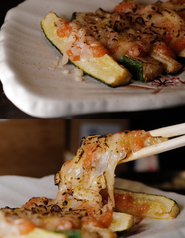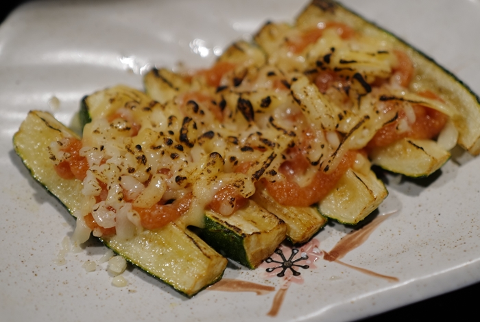 將櫛瓜切成長條形更好入口,上面加上明太子跟美乃滋、起司一起炙燒,入口的口感除了有櫛瓜豐富的水分以外,明太子的鹹味跟起司的香氣還有美乃滋的滑順,也讓人相當喜愛,這一道下酒菜也很受歡迎,尤其女性朋友絕對一定要點!! |