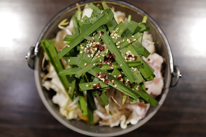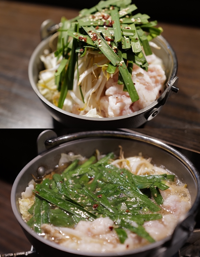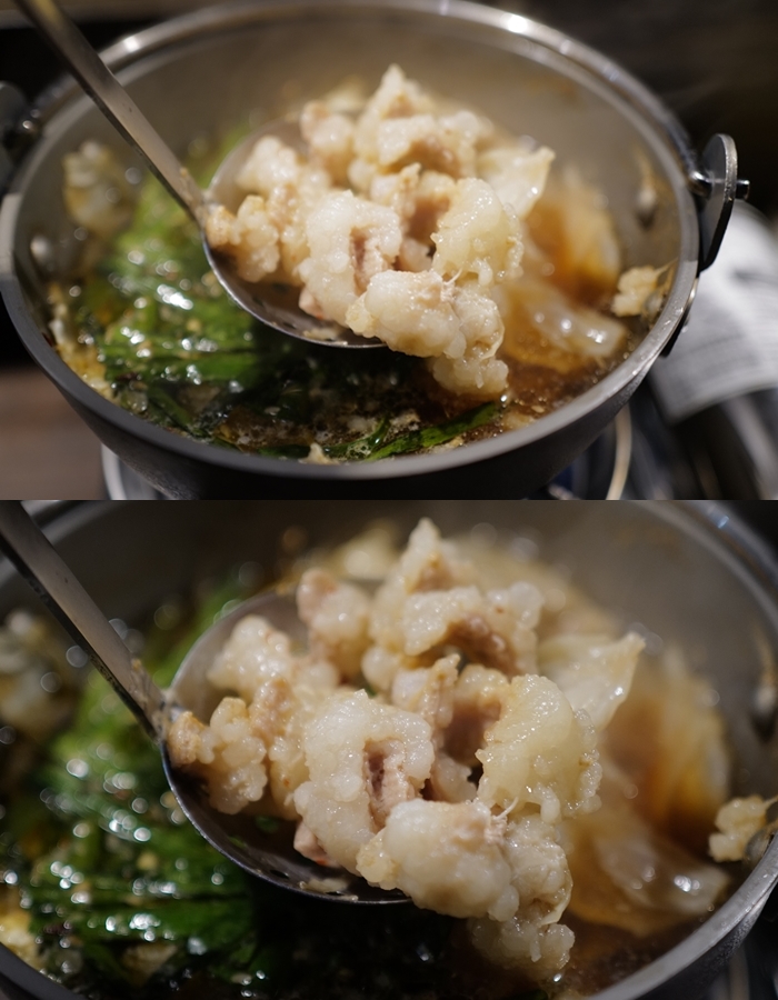 肥美鮮嫩的牛腸,切的滿大塊且份量頗多,也因為份量較多所以熬煮出來的湯頭真的香氣四溢,牛腸的美味再於放入嘴裡慢慢咀嚼的香氣,那油脂慢慢地散發出來,再搭配的一杯純米吟釀的清酒,讓清酒散發出來的米甜味跟牛腸的油脂交織,那滋味你必須試試看,你就會知道為什麼日本人愛上這一鍋牛腸鍋!