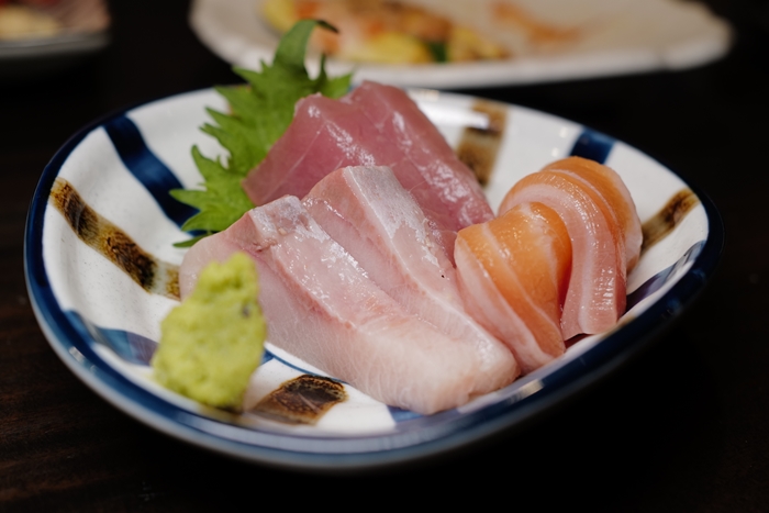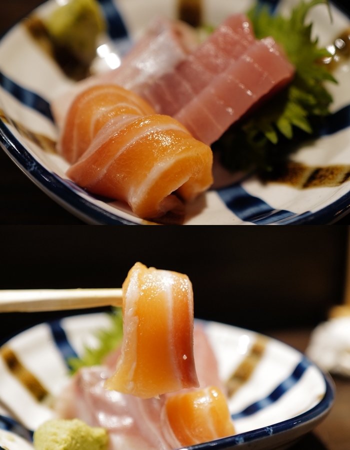居酒屋通常不太提供生魚片,但是幸ちゃん的日本客人佔大多數,所以生魚片也不能少,生魚片的部分都是挑當天新鮮的漁獲來提供,鮭魚的部分油脂都很豐厚,入口很甜,肥滋滋的超討喜。 |