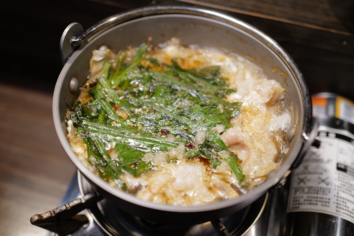 朋友說幸ちゃん的招牌是牛腸鍋,一開始我自認為我在日本也吃過不少牛腸鍋,但是我都不是特別喜歡,因為我覺得吃起來的味道較淡,但是朋友極力推薦了,所以就特別點來試試看,幸ちゃん的牛腸鍋賣項確實也比日本好許多,大多都是使用淺鍋,但是幸ちゃん使用的是深鍋,很符合台灣人的餐飲文化,點火後就讓他先煮一下。 |