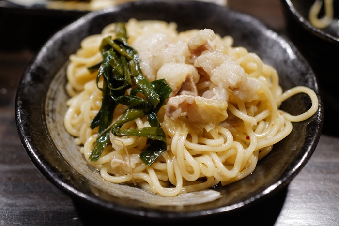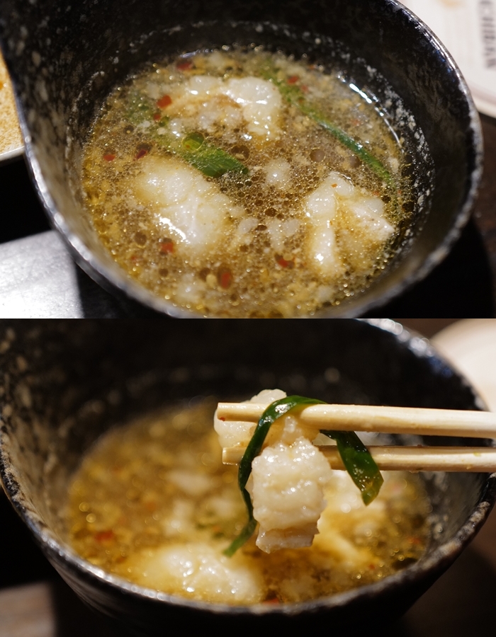 剩下的一些湯,我喝了一口後也超驚艷,跟福岡的牛腸鍋不一樣,完勝福岡牛腸鍋,尤其油脂的香氣豐厚又濃郁,下口的滋味偏鹹但是超適合我這種重口味的,喝酒的酒客口味都會偏重,一整個超適合,尤其那油脂的香氣一直在嘴裡縈繞著。 |