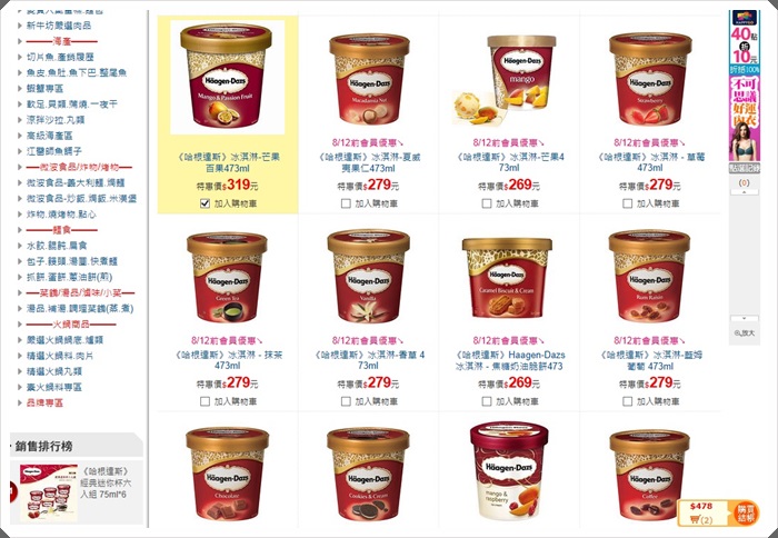 這時候看到哈根達斯兩眼就發亮了!!! 看到整桶的芒果冰淇淋讓我跟MOMO樂不可支,就心情很美好的給他點下去了,超開心的啦!! 每次去超市要買冰淇淋都怕拿回家就融化了,而且要在網路上買哈根達斯基本上都沒特價,加上冷凍運費又超貴的!!!