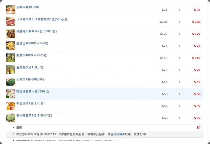 經過我使用一指神功跟愛買線上購物的一陣廝殺後,點選結帳後出現的畫面,非常清楚的列出剛剛選購了哪些商品跟儲備糧食,連商品規格跟重量還有數量都會標示出來,如果有超過一定金額,就會看到在運費的地方是0,猜猜看小寶剛剛這樣大戰了許久需要多少錢?