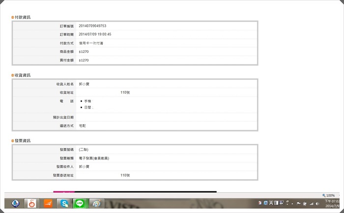 都確認完後資料送出就等著收商品了,最後的畫面就是照片上方一樣,有付款資訊跟收貨資訊以及發票資訊。 |
