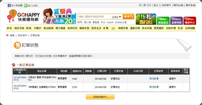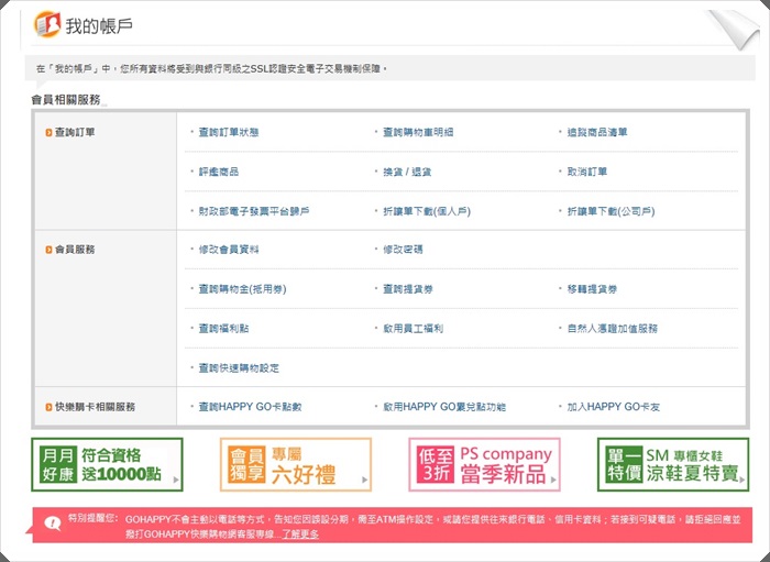 都完成後可以到我的帳戶裡面看一下,除了會員服務以外還有查詢訂單狀況等等的功能。 |