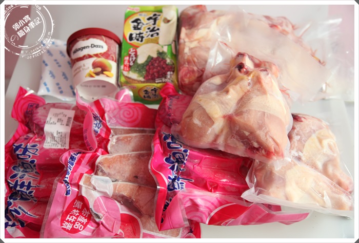 把冷凍的商品通通拿出來擺在一起,相信我這些冷凍商品至少脫離冷凍車到我拍照結束至少超過20分鐘了,但是還是可以看到商品全部都是硬邦邦的,外表依然結霜,可見得運送過程中的冷凍低溫有多麼保鮮,最讓我大喊超值的就是進口棒腿,當初買了369大洋,可是來了滿滿的三大包,棒腿每一隻尺寸都頗大的,我每次宵夜煮麵的時候都喜歡放雞肉下去煮,現在可開心到我了,已經在打算這些好吃的雞腿一些拿去滷雞腿,一些放著讓我吃宵夜的時候加麵吃了XD