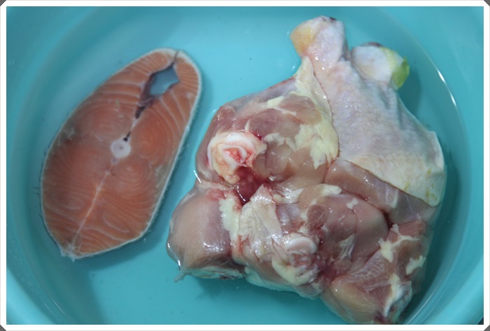 下午4點就開始著手準備晚餐,先把鮭魚跟雞腿放在水盆裡面解凍,雞腿每隻都超大隻的,那麼大的一包裡面是三隻雞腿,因為太晚拿出來常溫解凍,所以才放在水盆裏解凍。 |