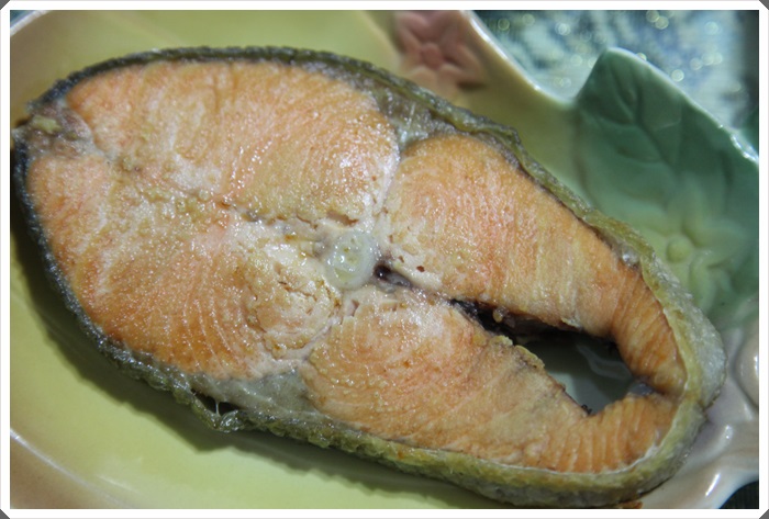 鮭魚當然二話不說直接煎了它!!!! 這一大片鮭魚切片幾乎都是我吃掉了,我好喜歡吃鮭魚唷!!! |