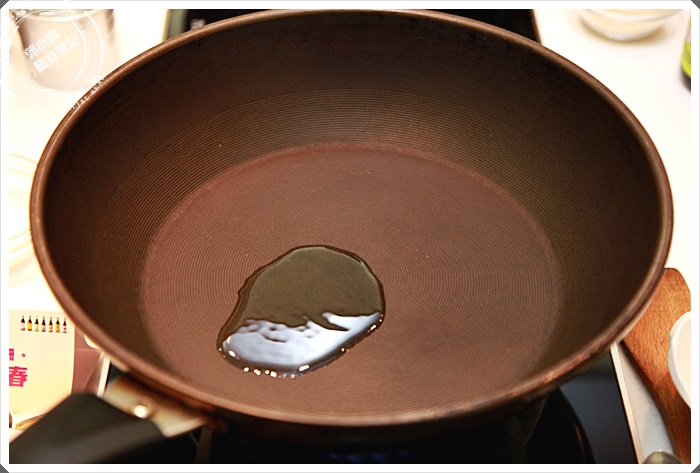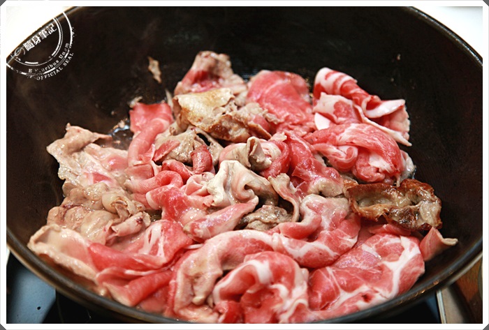 倒上一點橄欖油後,先開大火讓鍋子熱了以後一切就準備開始了,這豬肉壽喜燒其實真的很簡單,整個過程大概不用15分鐘就可以整個完成了。 |