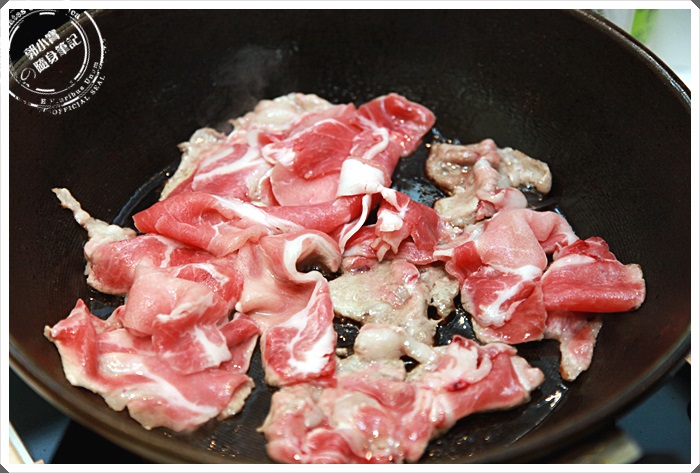 將肉一片片的放進鍋裡,記得一片片的放進去,如果你一次放進去肉會很容易糊在一起,很容易造成半生不熟的狀況,這一點黃景龍師傅有特別的交代了一下。 |