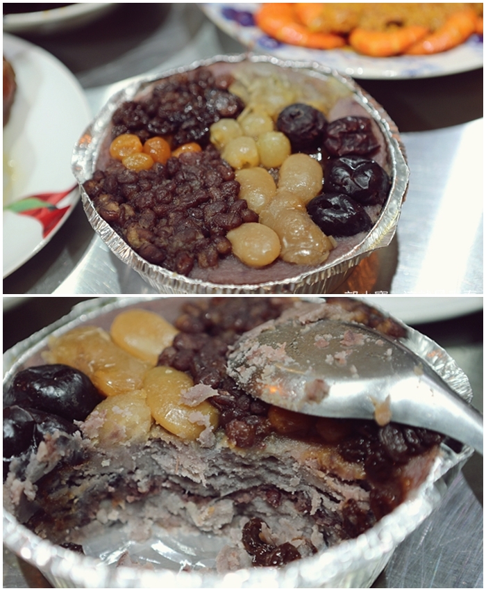 好幾年也沒吃過那麼好吃的八寶芋泥,上面鋪滿了葡萄乾、冬瓜糖條、金桔、紅棗、糖蜜棗、蜜紅豆等,往下挖的時候才發現中間又有鋪一層紅豆,芋頭真的是萬年不敗的甜品,濃郁的芋頭香氣搭配八寶珍果不論口感還是香氣都非常紮實,每一口都滿足。 |