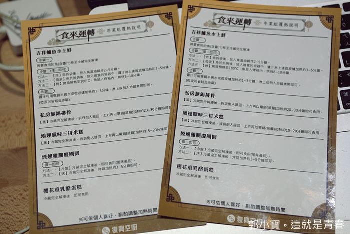 裡面都有放上說明書,仔細講解每道年菜的加熱方式,盡量少用微波加熱,以免破壞食材的原味及口感最重要。 |
