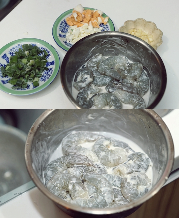 先準備剝好殼的新鮮大蝦、蔥花、蒜頭、鹹蛋黃。,將大蝦跟麵粉加點水攪拌後即可。 |