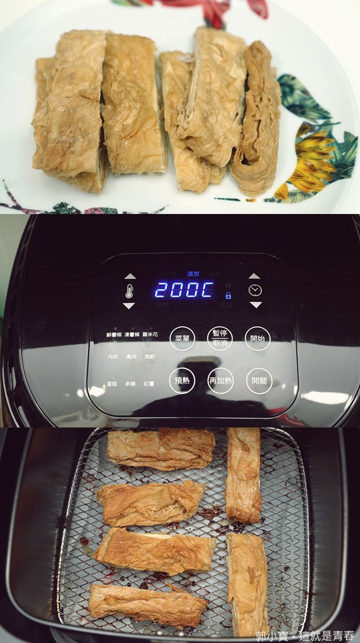 看看這炸豆皮的成果也超好的,調整到200度炸8分鐘即可,一口咬下的酥脆度十足以外,中間還帶一點點豆皮的豆香味,這一道最後變成我們家最常用的一道氣炸鍋料理。 |