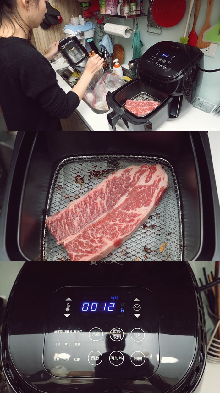 最後免不了要來試試看炸牛排的部分,基本上氣炸鍋炸這類還有油脂的肉品都不差,我們家因為太妃喜歡吃比較熟的牛肉,加上Cola還小的原因也不敢太讓她吃太生的肉品,所以我們是設定牛排180度12分鐘。 |