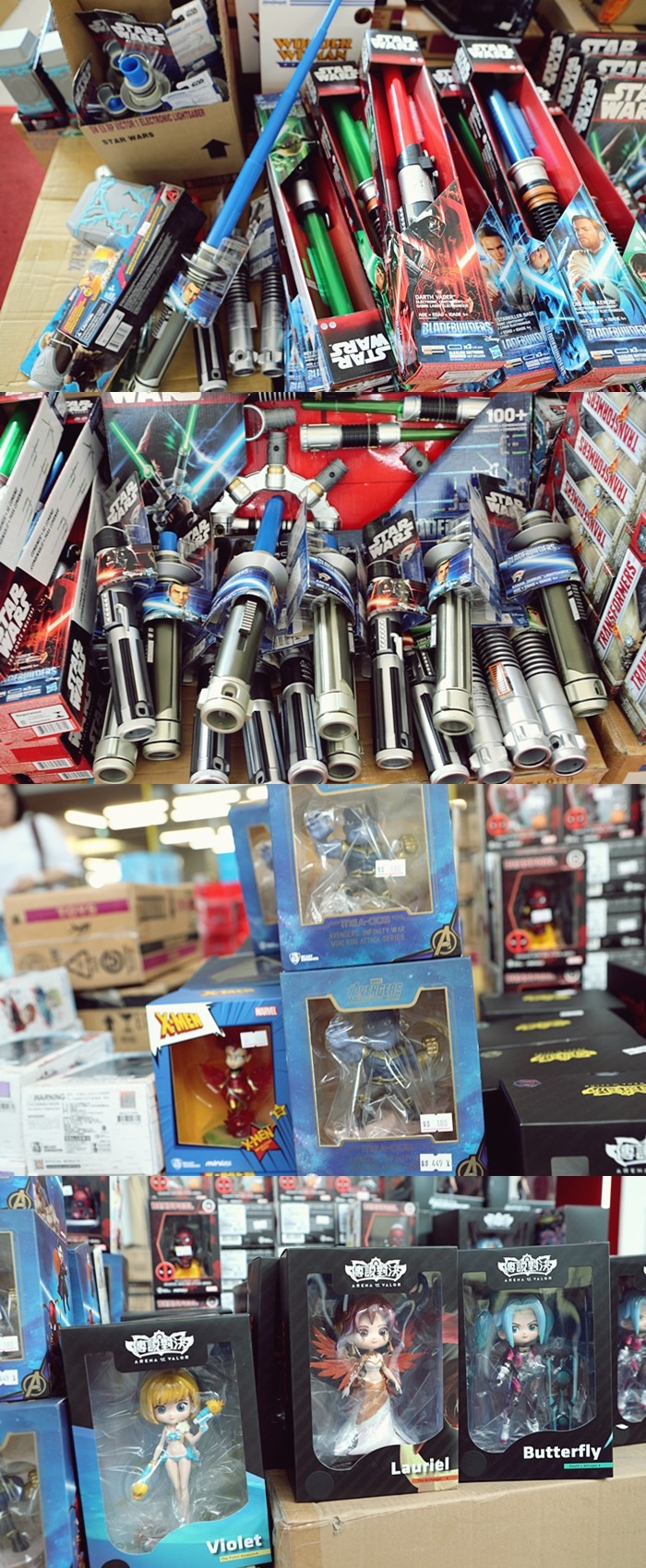 除了有小男生必備的星際大戰伸縮光劍以外,還有超稀少的傳說對決的角色公仔,這一批貨真的非常少看到,而且保證是正版商品,這一家玩具批發商的商品幾乎都是正版品,品質非常有保障。 |