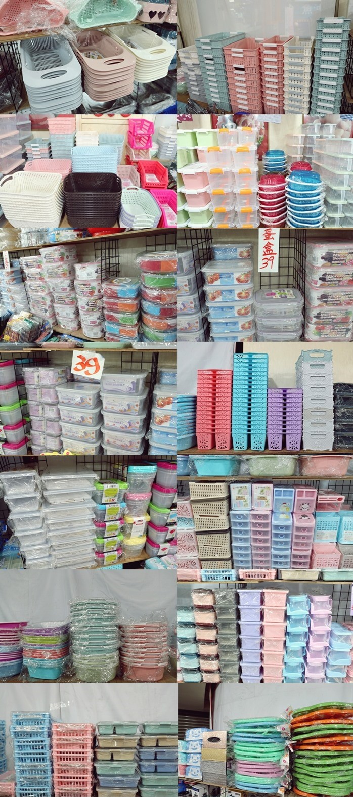 各式各樣的置物籃跟水洗藍、每種尺寸都有準備,39元價位比大創還要便宜,連小北百貨都望塵莫及,不管是媽媽廚房需要的洗菜藍還是浴室需要的置入藍,書桌的文具盒通通都有,這樣的價位真的太值得敗一圈了。 |