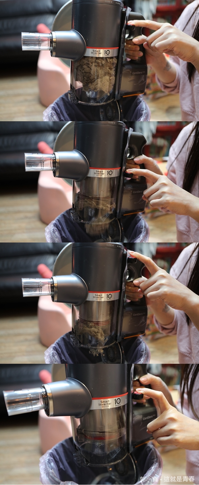 可以同時打掃的時後順便按壓這個把手,就會把毛髮垃圾往下推,讓集塵盒騰出更多的空間,大大增加集塵盒的容量空間。 |