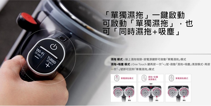 濕拖吸頭可以採用電控注水的方式,可以手動切換出水量(無-一段-二段)。 |