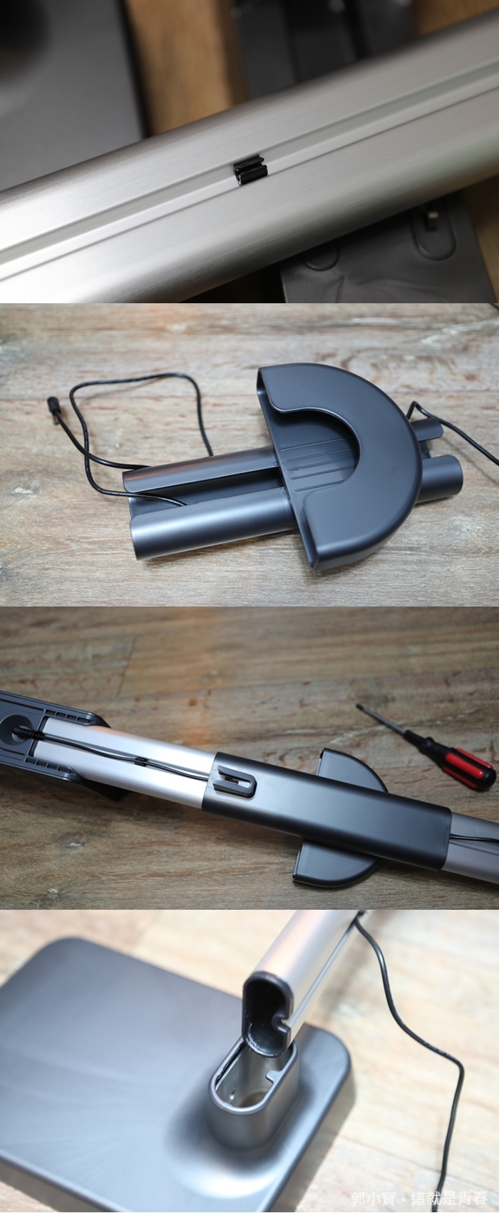 組裝底座一點都不難,唯一要注意的就是因為現在多了濕拖頭的放置架,所以第一個步驟就是一定要先把電源線先拉好,再安裝其它部分跟插上底座,就這線就可以收得很漂亮,隱藏在支架裡面!! |