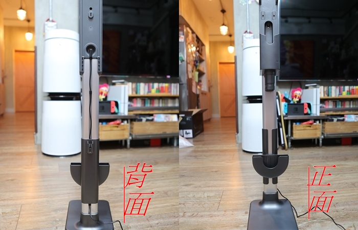 直立式基地座充站的底座加重,所以相當堅固也不會因為碰撞就倒下,重點是因為本身底座就加重,所以不用破壞牆面釘牆固定,光這一點就超貼心,且除了主機以外還可以吊掛三款常用吸頭。 |