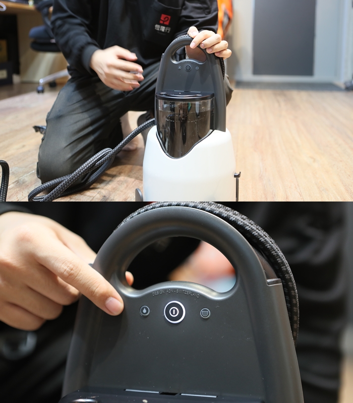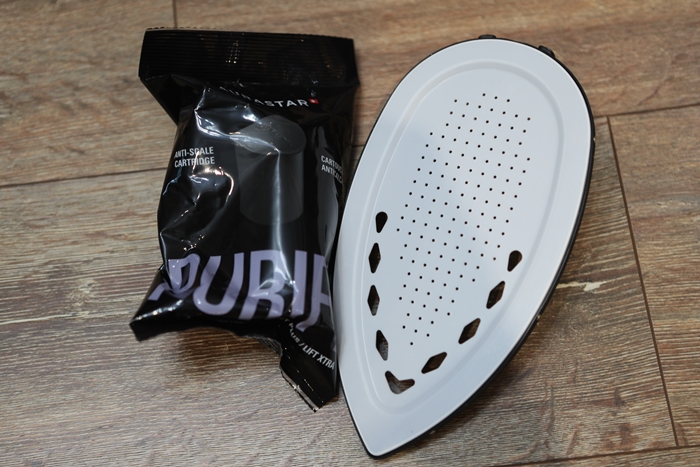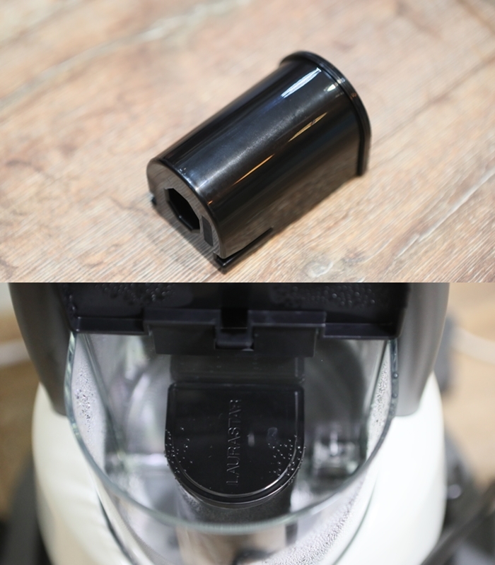 水箱的部分是可以拿取的(容量 1.1L),使用前還要先將專用濾芯放進去,濾芯可以過濾水中的鎂與鈣,確保不會造成水垢的問題,去影響到主機鍋爐運作跟熨燙的水垢問題。工作人員說為了主機產生的蒸汽能達到一貫的數值,盒中的水必須最好含有些許的礦物質,所以不建議使用逆滲透壓水以或者蒸餾水。